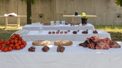 The teaching action offers visitors an immediate access to the artist’s practice – an invitation not only to view Nitsch’s idea of the Gesamtkunstwerk, but to understand it as a physical and mental experiential space.